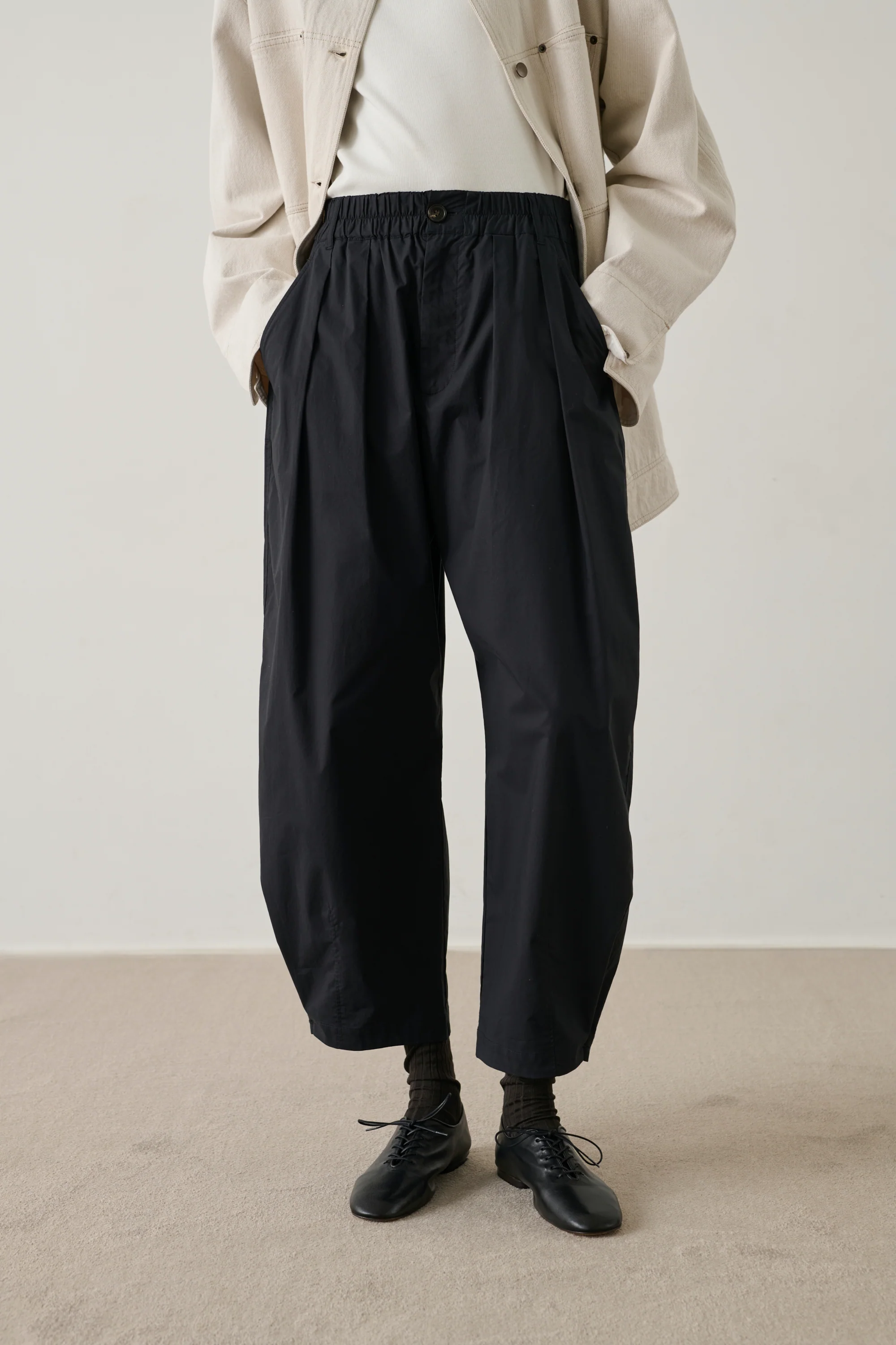 - Coupe ample, arrondie et légÚrement étroite en bas de jambe